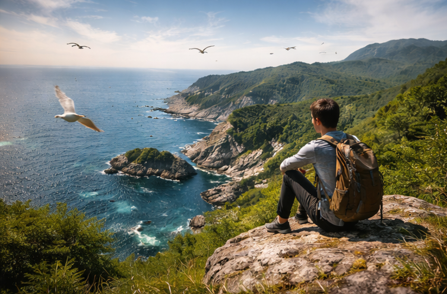 海と陸の境目は,鳥目線想像の定番です。「この岬を回り込むように飛ぶ」「波の白と岩の黒がどう見えるか」と考えると,スケール感が一気に広がります。