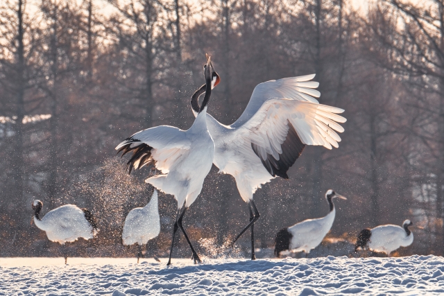 タンチョウのダンスは、繁殖期(主に冬から初春)に見られる儀式的行動で、鳴き声を交わしながらジャンプしたり、羽ばたいたり、同じ方向に回転したりするペアの舞踏です。