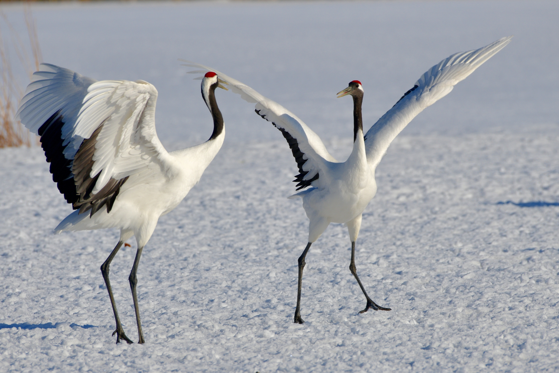 タンチョウのダンスは、繁殖期(主に冬から初春)に見られる儀式的行動で、鳴き声を交わしながらジャンプしたり、羽ばたいたり、同じ方向に回転したりするペアの舞踏です。